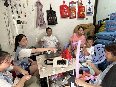 现场,小朋友一开始都有点害羞,不愿意和实践队员们交流,只有小朋友的爸爸妈妈热情的和实践队员们介绍小朋友的情况,不至于尴尬冷场。但是当实践队员们拿出为小朋友准备的零食和气球时,小朋友就慢慢开始讲话,在实践队员们和家长营造的欢乐氛围里,小朋友开始和实践队员们玩气球,画画,当小朋友因为实践队员们折出的气球而高兴,逐渐接受这些突然来到家里的实践队员们,大家都感受到了爱的力量。