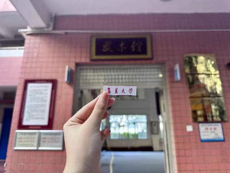 图为集美大学校牌与厦门市乐安中学武术馆合影 施昕怡摄