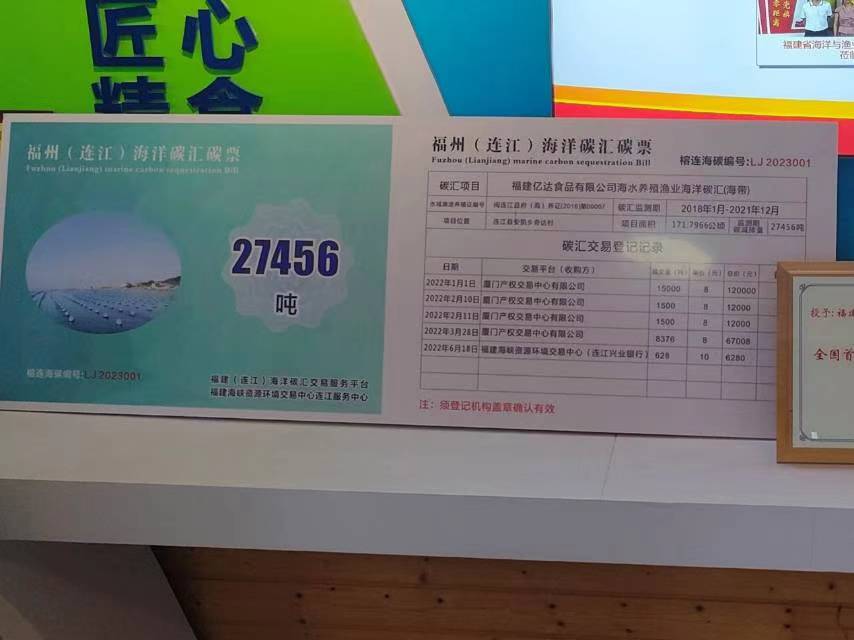 福建亿达食品有限公司作为福州本土的海带产业化龙头企业,率先于福州(连江)碳汇交易服务平台完成了第一笔海洋碳汇确权登记。2023年6月3日,在福州举行的海洋(渔业)碳汇高峰论坛上,连江县向福建亿达食品有限公司颁发了全国首张由海洋与渔业部门备案确认的蓝色碳票。蓝色碳票是依据中华人民共和国海洋行业标准《海洋碳汇经济价值核算办法》,经第三方机构监测评估、认证,海洋与渔业局备案,海洋碳汇交易部门登记的海洋碳汇量而制发的具有收益权的凭证。