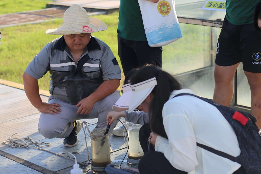 在东溪水库,实践队员们跟随着徐竣副主任来到大坝上感受河流上游清澈的水质与宜人景色。据悉,东溪水库作为武夷山市最大的饮用水水源地,坐落在离东、西溪汇流口上游7km处的东溪上,坝址流域面积554 K㎡,多年平均径流量6.623亿m³,是武夷山市水生态修复、水资源保护、水安全保障的重点区域,关乎着武夷山市饮用水安全。“这的鱼类丰富,生态优良,同时我们还配备有实时水情测报系统,能及时发现水库的变化。”他介绍到。紧接着,实践队员们乘着游艇来到水库中央与水源源头取水口采样点进行样本地采取与测量。