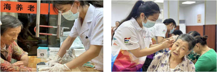 实践团联合来凤街道中心卫生院,为花园和西街社区的老年人提供了包括血压、血糖测量等系列义诊服务和AD8(认知障碍自评量表)等问卷调查。为促进老年人对失智症的认知,促进早防早智,实践团成员还针对老人及养老服务站工作人员开展了健康科普教育及技能学习宣讲,涵盖预防失智、中医常用急救技术、中医家庭保健适宜技术等内容,老人们还亲身体验了中医适宜技术,如耳穴压豆、肩颈按摩等,现场气氛温馨而热烈。