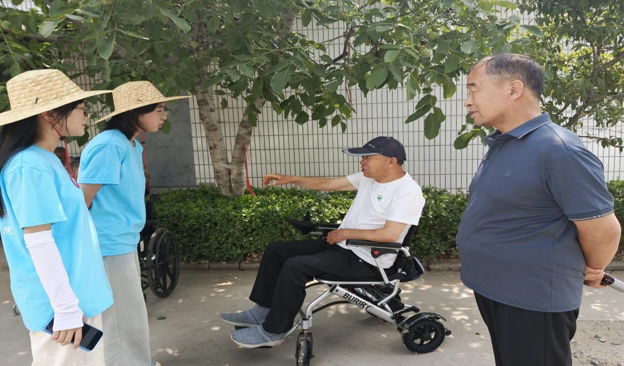 图为助农团成员与当地农户交流农情