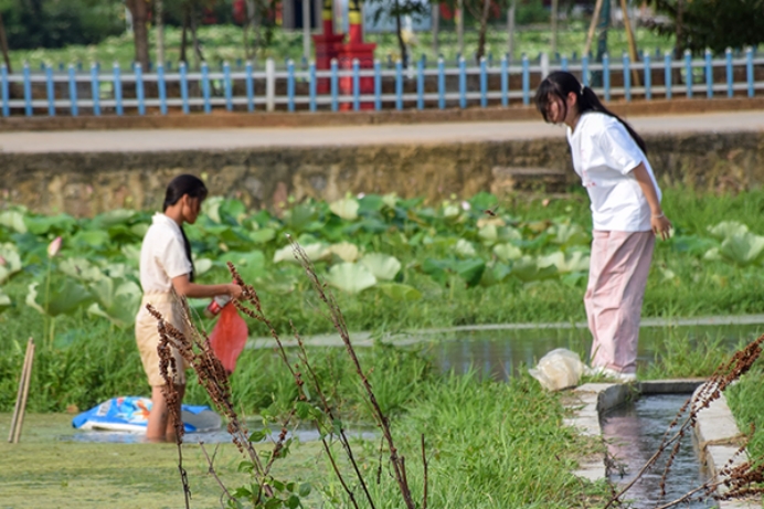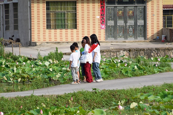 志愿团成员喻婉莹对在农田劳作的村民进行采访,他们说道;“这片农田今年是第一年种荷花,荷花长势与去年相比略差,但是今年田里的鱼明显增加,希望明年荷花和鱼能长得更好,我们也欢迎来自各地的人们到金兴来旅游。”