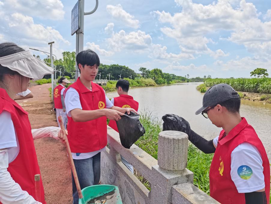 在调风镇调风河,团队沿着调风镇母亲河——调风河的河道对各类废弃物进行分类捡拾与清理,并积极向过路群众宣传保护环境的重要性,呼吁群众积极支持、共同参与并监督河湖的管理和保护工作。