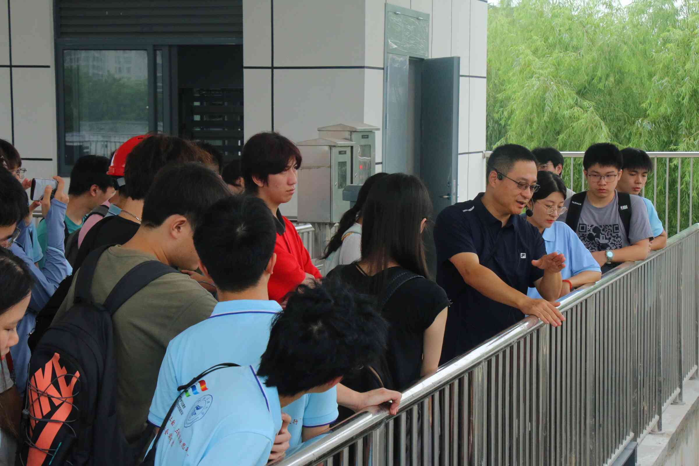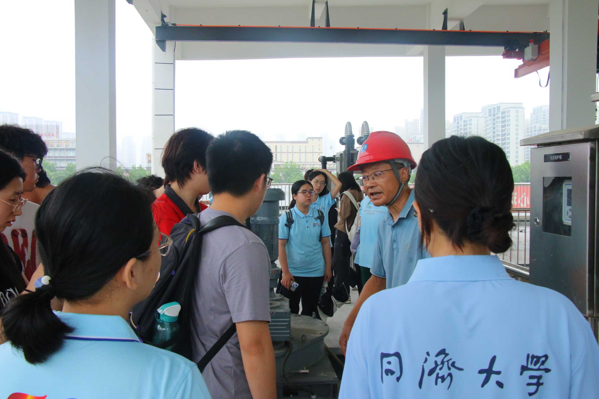 图为同济大学董滨教授(左二)向同学们讲解二沉池中刮泥机的工作原理。通讯员 邓以诺 摄