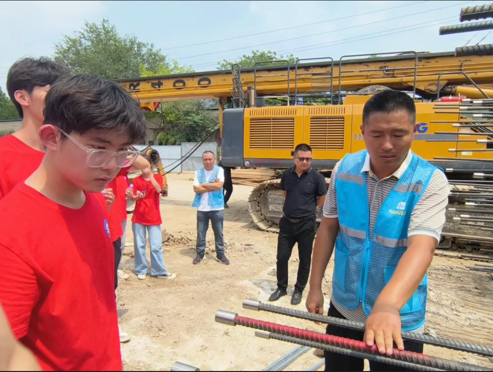 最后,在参观之余,实践团在停放施工车辆以及摆放施工用具处向负责人团队询问有关实际工程中专业知识的实践问题。负责人认真地讲解各种器械与构件是如何投入到工程中去的,并向实践团展示了钢筋连接等工艺的具体做法。