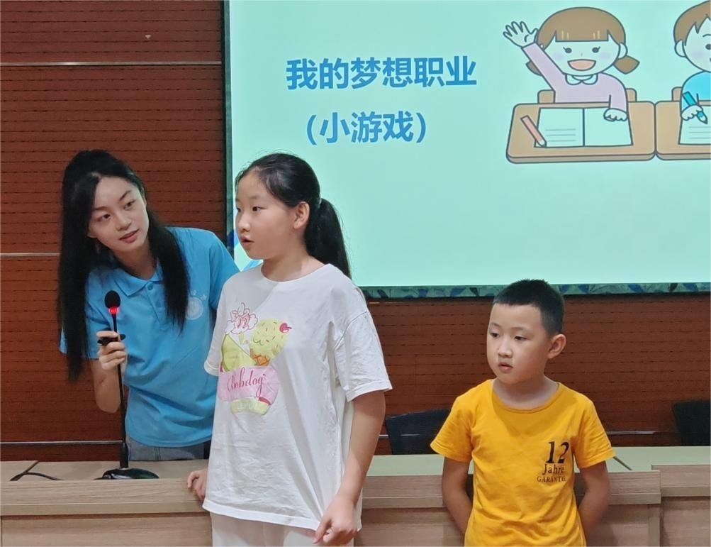 活动伊始,志愿者们简明扼要地向小朋友们介绍了课堂的主要内容和大致流程。小朋友们在志愿者们的指导下,认真准备并完成了公众演讲。台上的小朋友们个个神采飞扬,以稚嫩的童声清晰地表达着自己的看法,积极展现自我风采。为了让小朋友们怀揣梦想、勇敢追梦,志愿者们精心组织并引导小朋友们分组开展了“我来演示你来猜”的职业竞猜游戏。小朋友们轮流上前,生动地表演自己梦想中的职业,而组内其他小朋友则根据他们的表演来猜测职业。令人惊喜的是,小朋友们的职业理想已不再拘泥于“科学家”、“警察”这类神圣的职业,他们将环卫工人称作“城市美化师”、将“外卖员”称作“神奇的美食魔术师”。小朋友们关注更多平凡的职业,尊重劳动,展现了新时代少年儿童的崭新风貌,让志愿者们也深受教育和启发。