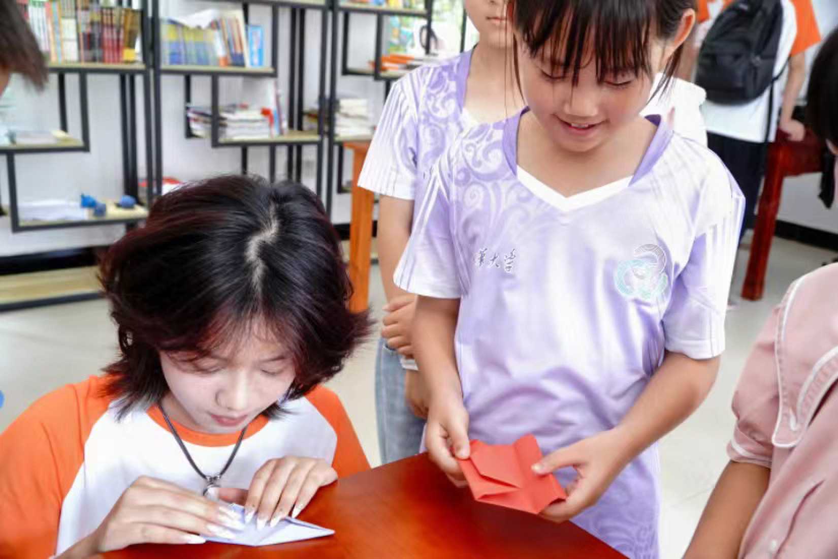 最后一节课是美术课。成员们提前准备了一些卡纸并分发下去,由成员们在讲台上教,孩子们在下面学,对于折纸孩子们表现出极大热情,每一个人都积极回应。