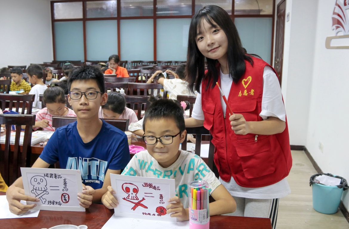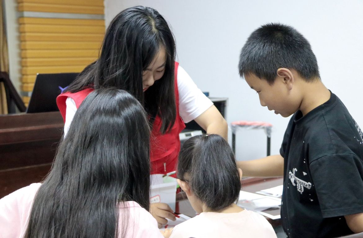 图为“薪火相传 代代守护”实践队成员耐心教学小朋友绘制禁毒宣传画。