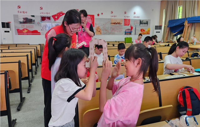 “我做好了,我是第一名!”,一名小朋友高举自己的作品欢呼道。不一会儿,小朋友们兴奋地通过潜望镜打量着周围的环境,又一名小朋友骄傲地说道:“以后我要做一个更大的潜望镜,把老师们和同学们统统装下。”他们亲手组装的潜望镜,不仅承载着对科学的热爱,更是对未来无限美好的憧憬。这些实践活动,不仅让抽象的光学概念变得触手可及,更让孩子们在动手中体验到了科学的魅力与乐趣。
