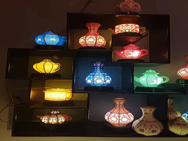 胡金龙老师的工匠精神不仅体现在对技艺精益求精的追求,更体现在对传统技艺的创新上。胡金龙老师向我们介绍,传统的灯彩工艺较为复杂并且制作成本高,为了更好的传播硖石灯彩文化,在手工制作大型展览、参赛灯彩作品的同时,采用了机器制做商品化的小型灯彩。硖石灯彩文创作品,在声、光、电、材料和传动装置等方面不断改进和创新,开发出了茶壶灯、壁灯、花瓶灯等风格独特、便于携带的小型灯彩。面对传统技艺在现代社会的挑战,胡金龙老师并没有选择保守和封闭,而是积极寻求传承与创新之路。同时,他还积极开展非遗教学活动,与海宁的各个中学、高校合作开展研学活动。