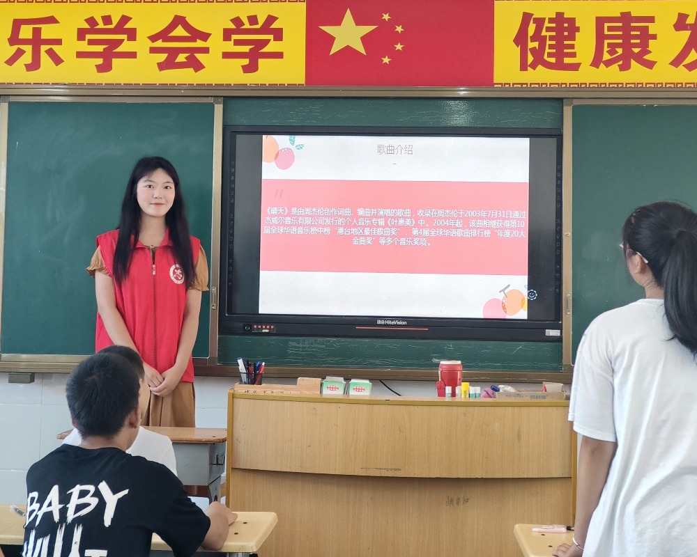 志愿者提前征集学生们的意愿,在课堂上教授《无名的人》、《晴天》等深受学生喜爱的歌曲,极大地调动了他们的积极性。志愿者教授歌曲前先补充了创作背景、主题情感等其他知识,拓展孩子们的知识面,并对部分作品进行赏析,提高孩子们的审美能力,不仅要在音乐的律动方面感染他们,更要从深层次的文化背景方面深化他们对音乐的感触,使学生从简单的喜欢会唱到热爱与享受,放声的高歌是身心的共舞,是从外到内的灵魂振动。