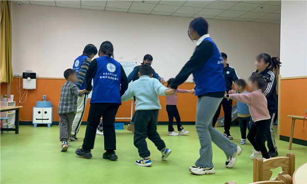 图为成员们辅助孤独症儿童完成课堂活动