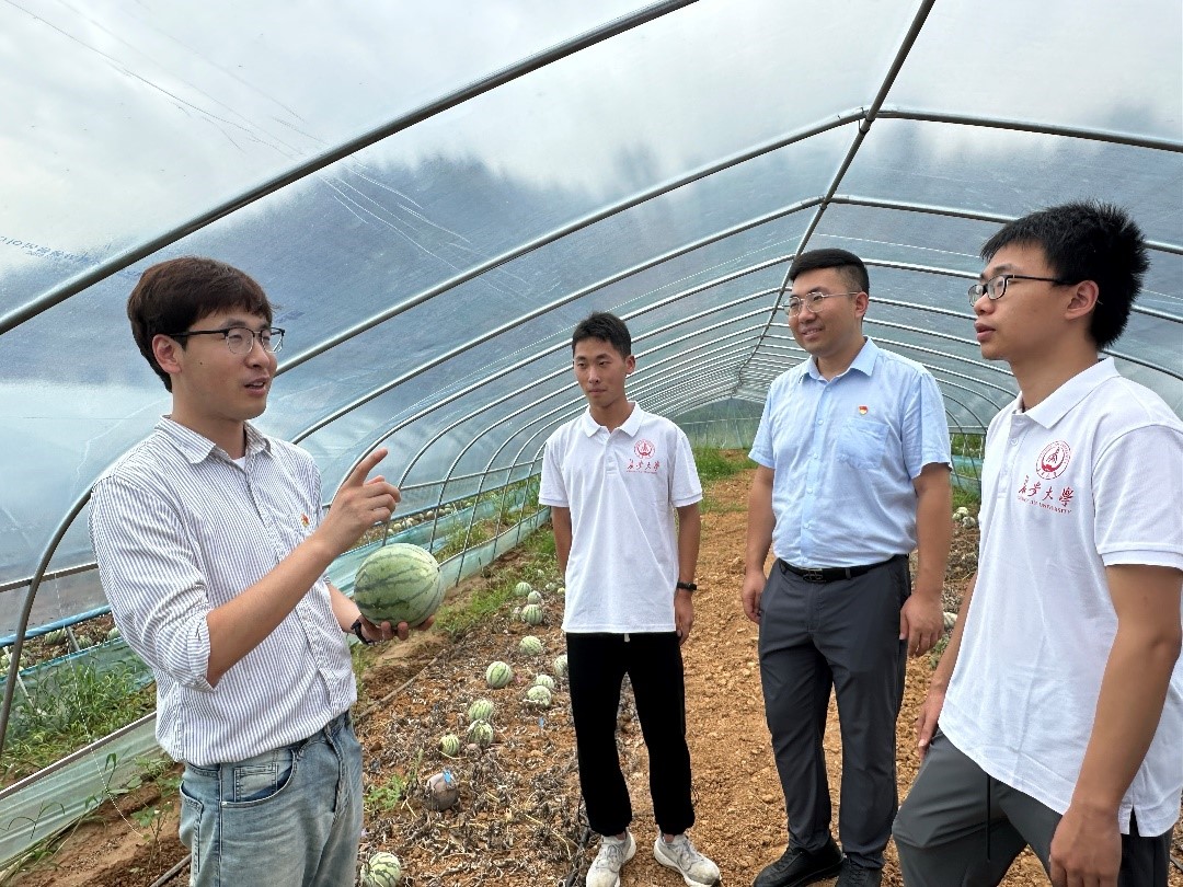 课上,付石向实践队员介绍了商南县莲花台村“一产茶菌果、二产矾硅镁、三产康养游”的特色;课下,他带领实践队员前往湘河精品西瓜示范园实地观摩,为实践队员详细介绍了示范园的建立过程及以西瓜为代表的农产品种植、销售状况,使实践队员切实体会到特色产业对推动乡村农业产业结构调整、促进地方经济发展的重要作用。