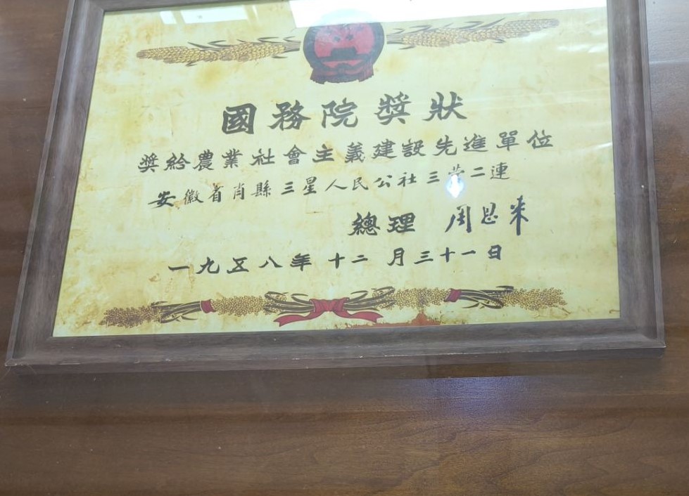 国务院颁发的周恩来总理亲笔题名的“农业社会主义建设先进单位”奖状 汤高峰摄
