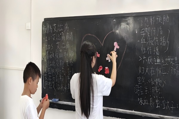 值得一提的是,为了让学生亲身体验参与预防艾滋病的过程,志愿者组织学生制作象征艾滋病防治的红丝带。尽管面临物资限制,学生们利用红纸精心制作红丝带,对此活动表现出了极高的参与热情。活动后期,孩子们亲手将自己制作的红丝带粘贴在教室黑板上绘画的爱心图案中。一方面这一举动体现了他们对艾滋病的深刻理解与关注,展现了他们关爱他人、尤其是艾滋病毒感染者和患者的温暖情怀。这反映了孩子们在情感与认知上的成长,通过实际行动传递了对受影响群体的支持与接纳,同时也增强了孩子们的社会归属感和自我价值认同。另一方面志愿者希望通过这次活动深入普及艾滋病防治意识和深切关怀弱势群体。通过这样的互动,志愿者们用自己的行动示范了社会责任感,同时也为孩子们树立了正面的榜样,让他们在实践中学会尊重生命、关爱他人,进而促进了整个社会对艾滋病感染者和病人的接纳和支持。