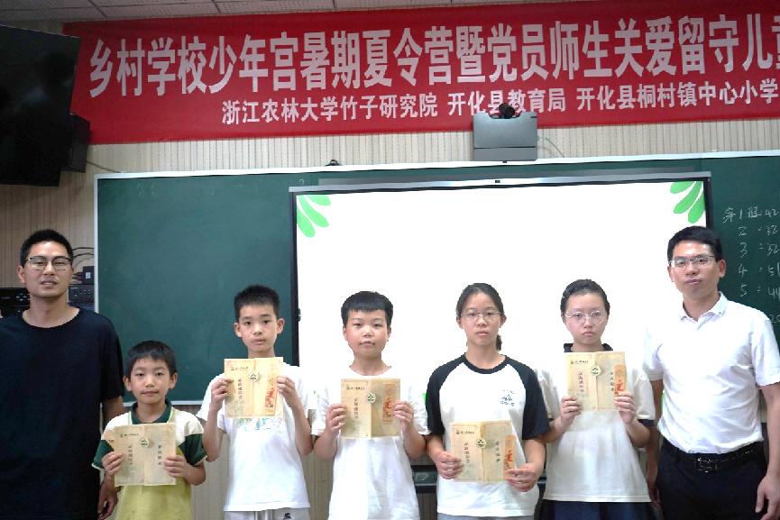 7月19日,浙江农林大学竹子研究院党总支书记周能寿赴开化县桐村镇中心小学慰问实践团队师生,桐村镇常务副镇长徐文俊陪同走访。在结业仪式上,周能寿与徐文俊为优秀学生颁奖,希望他们能发扬“竹子精神”,将来为家乡竹产业发展贡献力量。