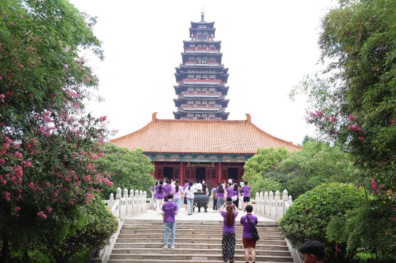 随后,跟随导游的步伐,实践团成员来到了望湖塔的脚下,望湖塔如一把利剑直插云天,实践团成员通过导游的讲解,认识到该塔是微山湖风景名胜区的重要组成部分,同时也是微子文化的象征之一,见证了微山湖的悠久历史和灿烂文化。在此之后实践团全体成员在望湖塔下集体合影。