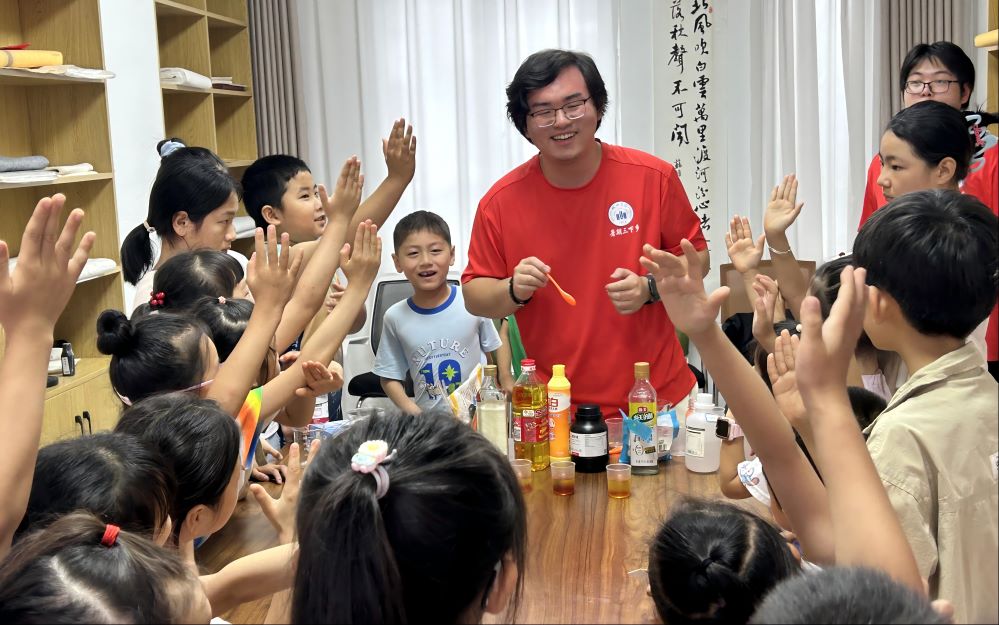 7月10日上午,实践团队利用专业优势,将学院志愿服务品牌项目“化学小课堂”带进毛坦厂镇八角塘村社区爱心驿站,开展化学科普宣讲与趣味化学实验。团队成员向孩子们展示生活中的化学,带他们动手做实验,在他们的心里种下了一颗学习化学的萌芽种子,为他们搭建了一个难得的化学学习平台。