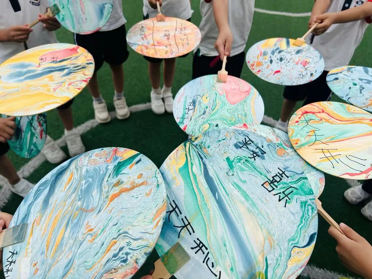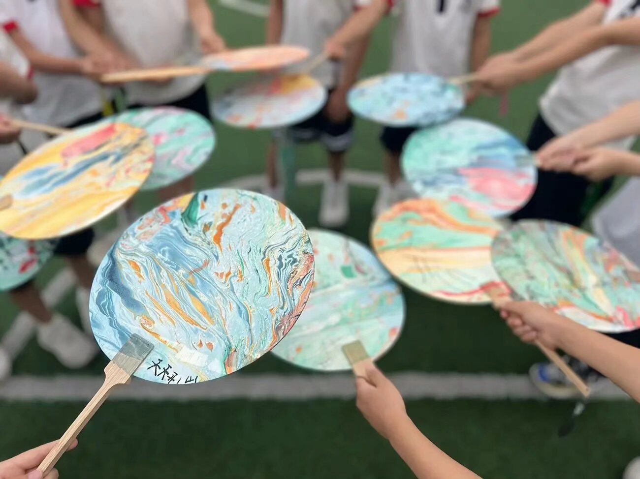 为更好地让学生了解及体验漆扇的制作过程,曲阜师范大学“丹漆随梦·乐道拾遗”实践队队员购买了制作所需的各种材料,准备了相应的PPT,进入多所校园和多个社区开展漆扇体验活动,同学们首先学习了漆扇的基本制作流程,包括选材、切割、成型、上漆等步骤。随后,他们充分发挥自己的想象力和创造力,在扇面上自由绘制出各种图案。有的同学选择了山水画,用细腻的笔触勾勒出山川的壮丽与秀美;有的同学则尝试了现代简约风格,用简洁的线条和色彩表达出独特的审美意趣,最后学生们将扇子放入水中,在实践队员们的辅导下,以点、甩、弹、划等手法,在水面绘出图案效果,再晕染在扇面,随着活动的深入,一把把精美的漆扇逐渐呈现在大家眼前,制作出的漆扇成品各不相同。学生们在保持传统工艺的基础上,融入了自己的创意与情感,使每一把漆扇都独一无二。