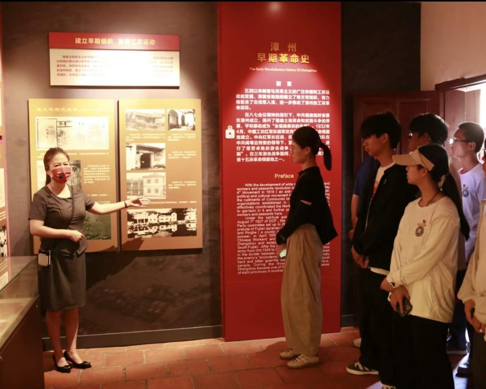 红砖砌墙,外墙上书写着一行有力的打字“组织民族革命战争,反对帝国主义瓜分中国”。实践队走进芝山红楼,又称毛主席率领红军攻克漳州纪念馆。20世纪30年代初,国民党摧残闽南革命,屡次进犯闽西苏区。时任中华苏维埃临时中央政府主席和中央革命军事委员会委员的毛泽东提出了攻打漳州的战略方案。攻克漳州后,毛泽东在芝山红楼居住了20多天。行走楼间,我们仍能感触到一代伟人和无数革命先烈们的信仰和坚定,革命精神打破时间与空间的界限,我们愿追随你们,不忘初心使命,胸怀忧国忧民之心、爱国爱民之情,以勤奋努力锤炼本领,以真才实学服务人民,以创新创造贡献国家。