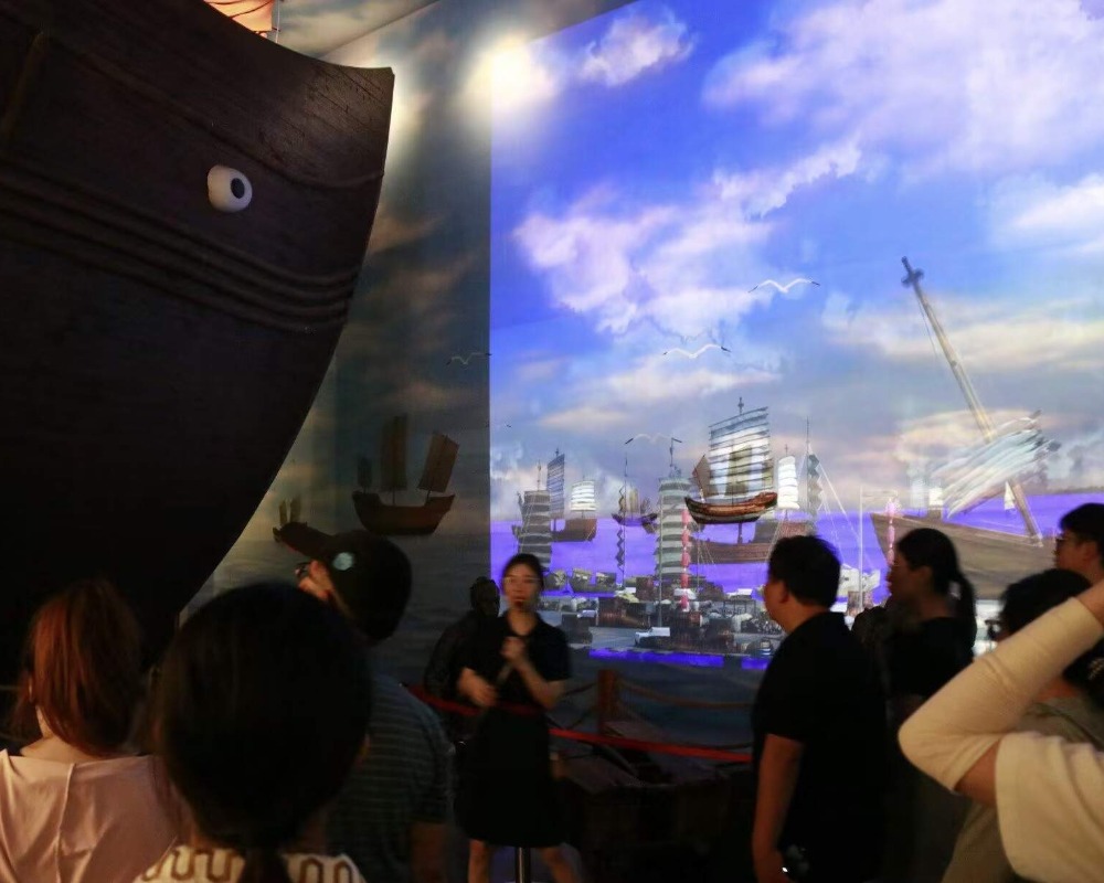 在漳州市博物馆:碧海云帆——漳州海上丝绸之路陈列馆,实践队见到了东溪窑生产的青花瓷、米黄釉等精美的瓷器,这些瓷器生产出来后装入竹篓、垫上稻草、包装严实后顺着九龙江到月港,换乘上“福船”漂洋过海,成为外国人“热门抢购”商品,不仅作为日用品,更成为贵族们的装饰品,实践队员们被博物馆还原的葡萄牙里斯本宫殿用瓷器装饰的屋顶所震撼。