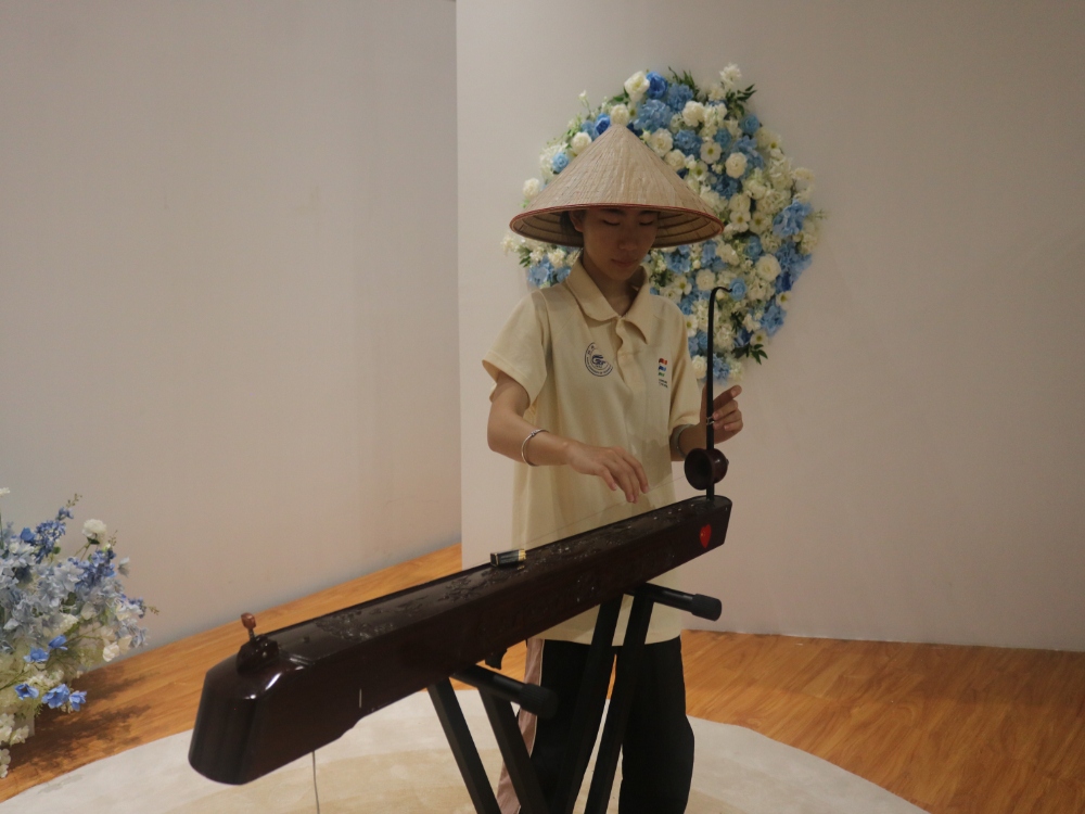 在京族文化艺术的展示区,实践团队更是被京族独弦琴这一国家级非物质文化遗产所深深震撼。京族独弦琴作为京族文化的瑰宝,其独特的音色和演奏技巧让人赞叹不已。实践团成员围坐在展区前,认真学习京族独弦琴发展历史及使用技巧,并亲身参观、体验了京族独弦琴的魅力。