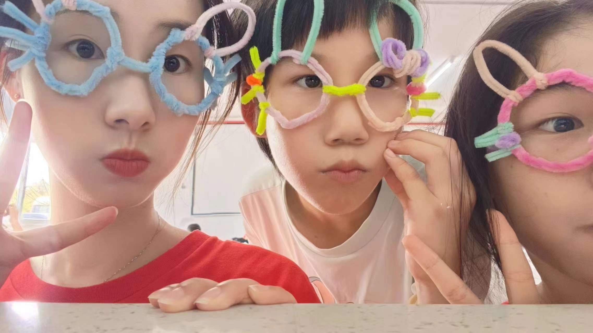 图为志愿者与小朋友展示自己的扭扭棒小眼镜