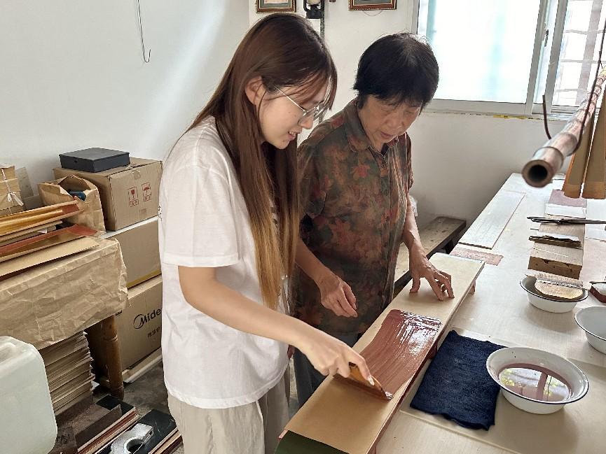 最后,实践成员跟随熊师傅体验了金箔锻制中的揹金环节。从刷纸、搭金到接金,每一步都凝聚着匠人的心血与智慧。整个过程极不轻松,光是贴纸就要做到一丝不苟。通过亲身实践,实践成员深刻体会到金箔锻制的精妙与严谨,每一道工序都需精准无误,方能成就那薄如蝉翼、熠熠生辉的金箔之美。师傅们厚实而生满老茧的手,流露的是持之以恒的努力、精益求精的态度以及无法比拟的热忱。正是这种工匠精神,搭建起了中国非遗传承的履带。