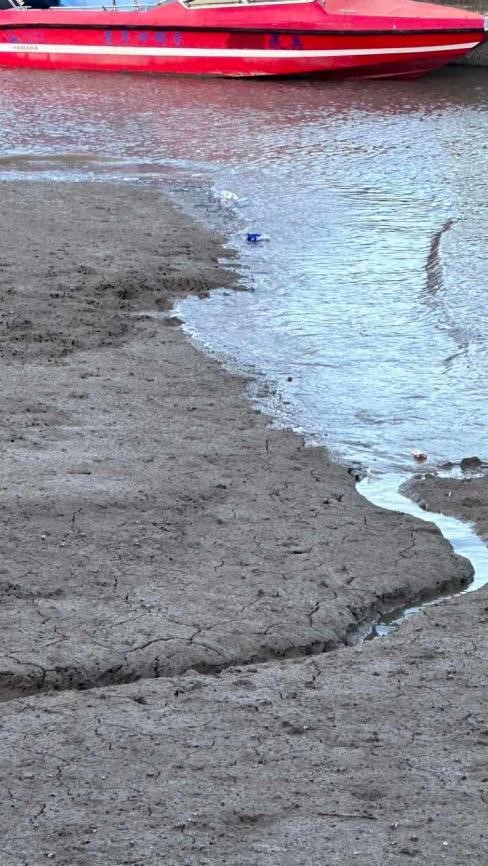 图为在渔村滩涂边遗留的白色垃圾,但由于距离较远,无法准确辨认。