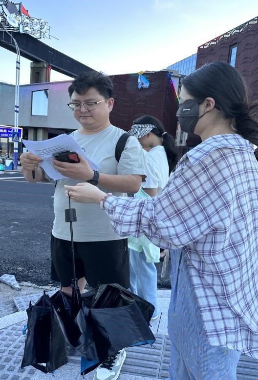 图为在渔文化馆外,成员邀请游客填写调查问卷并进行了随机提问、采访,填写者们均认真对待每一道问题,在过程中,实践团成员不断向填写者讲解并解答其困惑。