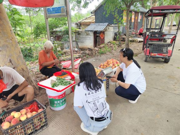 实践团来到夏庄村时,村民们正在路口摆摊售卖水果,品种丰富的山桃和芒砀山梨琳琅满目。一位大姐向我们成员,村民们的水果都是自产自销,她家专门以经营果园为生,她们在山上种植了各类品种的特色水果,旅游旺季果园生意兴隆。一位75岁老奶奶告诉成员,她主要在农闲时出来摆摊售卖,平时还会编织汉服流苏穗子用来补贴家用。村子里像她这样边耕地、边售卖农产品、边做一些汉文化产品边角料的村民还有很多。在周边村落,成员们还看到村民在售卖石雕工艺,卖农产品和非遗产品提高收入的同时,也用文旅产品传播传统文化。村口小小的集市,生动展现了当地文化与经济的相互促进与融合。