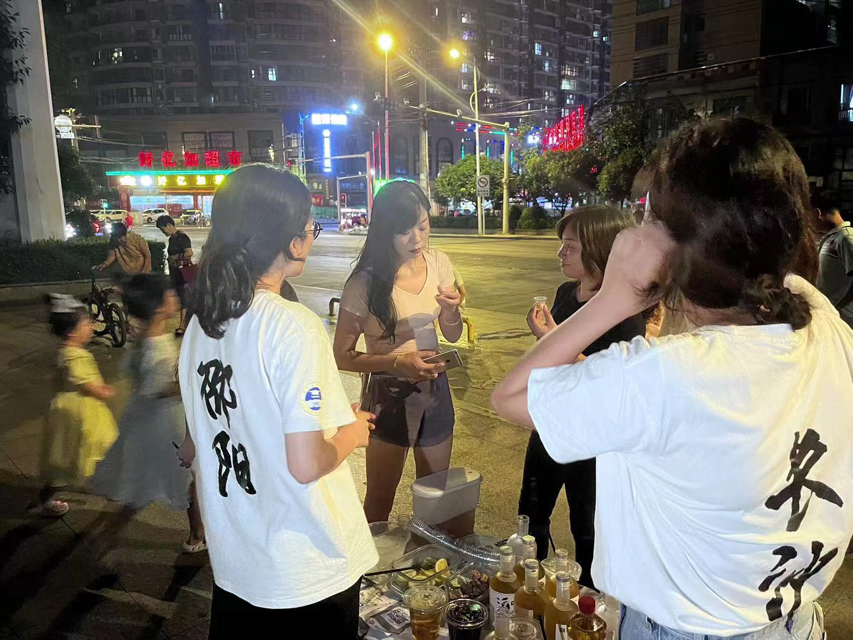 随着太阳西沉,夏夜的炎热并未减退,但江边散步的市民和广场上的居民却因“酒别重逢”团队的到来而感到一丝凉意。团队成员向来来往往的群众宣传水酒,将印有产品信息的扇子发放到顾客手中,让下源水酒在人群的讨论中传得更远。