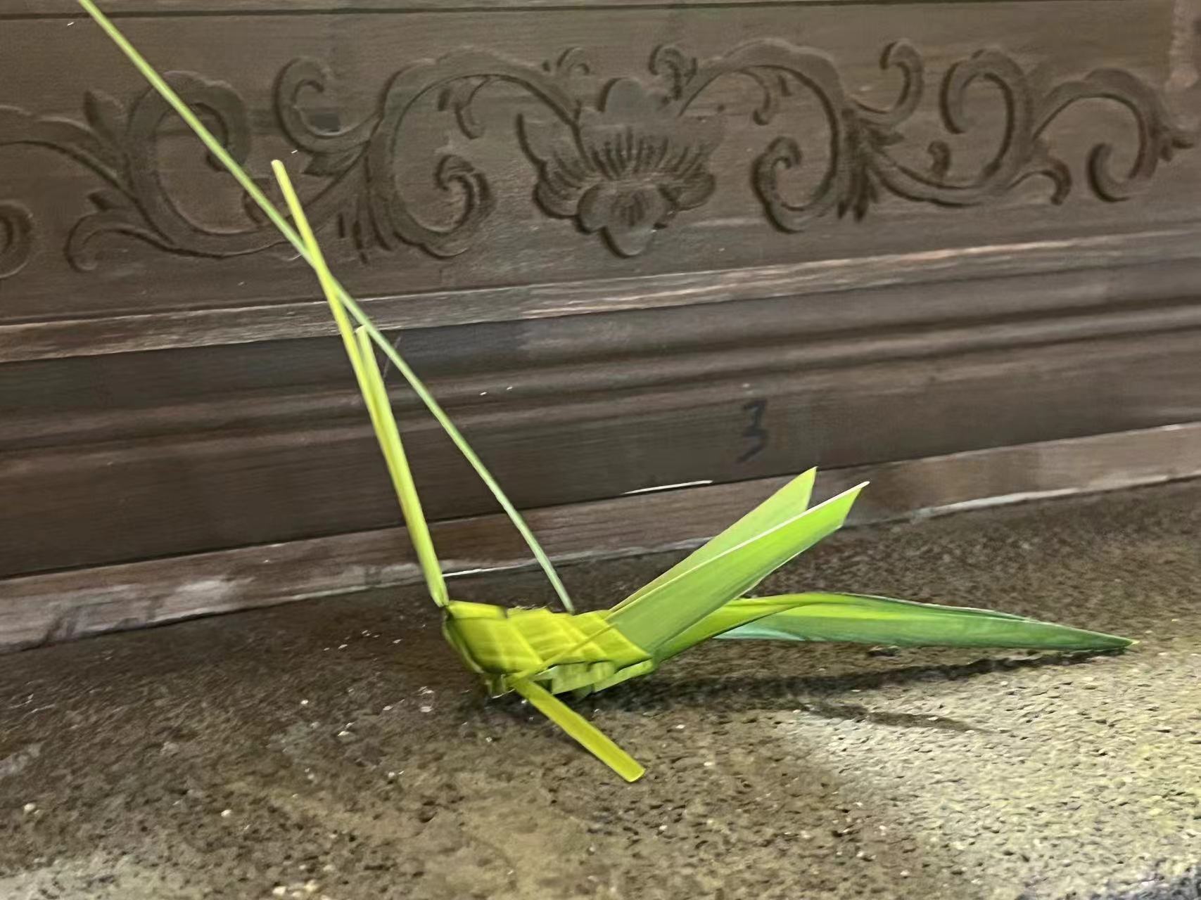 最挑战的部分是编织蚂蚱的触须和腿,因为它们要求极高的精确度和细致度。我全神贯注,生怕一丝疏忽导致作品功亏一篑。就在我沉浸于其中,体会着手工艺带来的无尽乐趣时,我的小蚂蚱渐渐“活”了起来。虽然它不如老师的样品那般完美,但看着这只由我亲手编织出的蚂蚱,我心中充满了无比的满足和自豪。