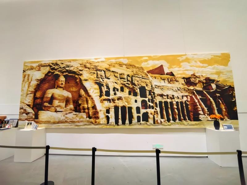 大同市美术馆坐落于大同文瀛湖畔,由世界著名的英国福斯特建筑事务所及中国建筑设计院设计。建筑主体由四个高度不等的三角锥形相连而成,形成雄伟的金字塔建筑布局。实践团成员在美术馆前合影留念。进入大同市美术馆,我们便能感受到浓郁的文化氛围。展厅布展充满了中华传统元素,彰显历史底蕴。