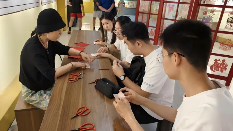 在参观与采访后,实践团成员为了加深对剪纸艺术的理解,在博物馆的工作人员的教学下,亲身体验剪纸艺术。实践团成员从简单的传统纹饰学起,深入感受剪纸文化的内涵。
