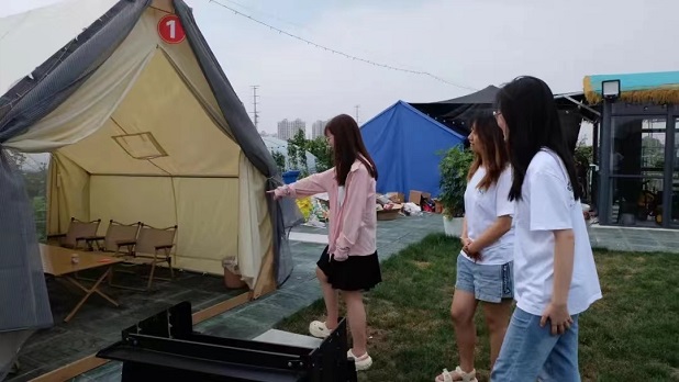 随后,实践团参观了宝应县的特色自助户外野炊区。宝应县利用其丰富的自然资源和特色农产品,开发了一系列户外自助野炊项目。游客可以在农家乐或指定的野炊点租赁炊具和购买新鲜的当地食材,体验自己动手制作美食的乐趣。在工作人员的指导下,团队成员详细了解了野炊烧烤的规范化流程,游客可根据个人喜好自选菜品,并在东华喜园提供的专业野炊帐篷中进行无烟烧烤。这种创新的烧烤模式实现了流程的自动化与高效化,不仅增强了游客的参与感和体验感,还直接带动了农产品销售和乡村旅游业的发展,助力贫困户脱贫,实践团成员对此表示了由衷的认可与敬意。