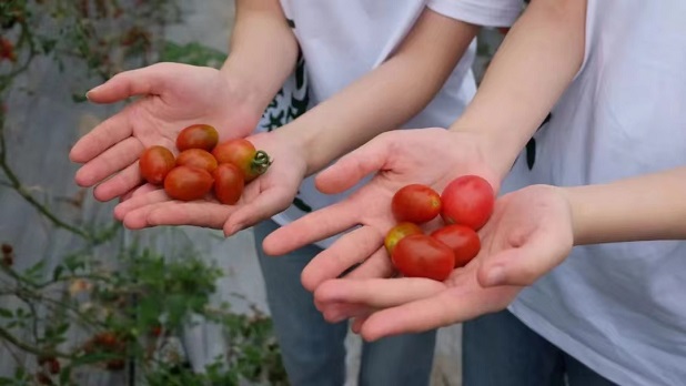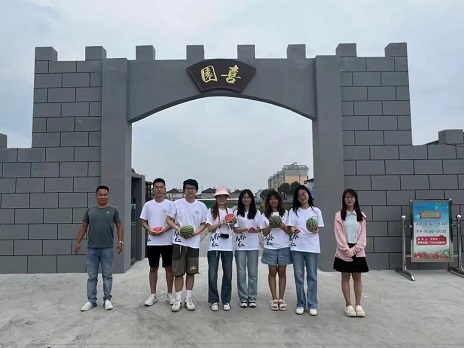 团队首先参观了东升喜园采摘园内的有机西瓜和番茄种植区域。据东升村工作人员钟宇新、花佩阳、何爱强等人的专业介绍,该园区的有机西瓜在严格的绿色种植环境下培育,具备小巧精致、甜脆可口的品质特点;而大棚番茄则经过创新性培养,成功培育出绿色、黄色、红色三种不同颜色的品种,各具独特风味,健康且美味。这两种产品作为宝应县的特色有机水果,深受市场欢迎,吸引了众多游客前来参观体验,实践团成员亦亲身体验到了当地特色食品的魅力。