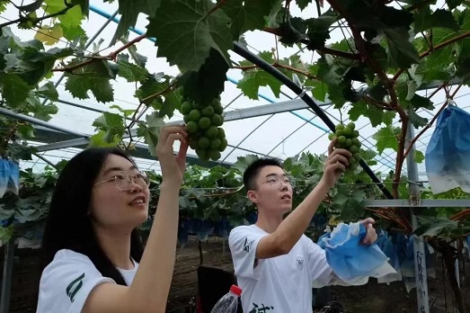 团队来到了广洋湖镇的葡萄产业园,在梁书记的带领下,实践团成员详细了解了广洋湖的葡萄产业,发现广洋湖镇依托本地优质资源来打造现代智能产业园,面积近800亩,种植“阳光玫瑰”等热销品种。经过广洋湖镇的智能化管理、高效灌溉助力高产,预计年产值超5000万,带动了经济繁荣,未来将持续壮大,成为农业支柱产业。