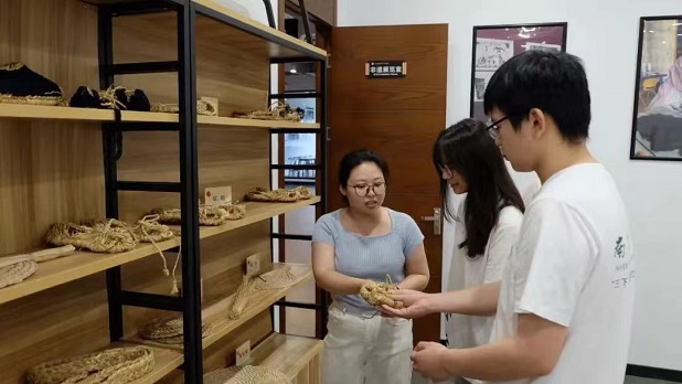 随后团队来到了广洋湖镇新时代文明实践所,王主任给团队成员介绍了广洋湖镇的著名非遗文化——版画,作为一种传统的绘画艺术形式,其主要技艺是在版面上刻画或制作图案,然后通过印刷的方式将图案转印到纸张或其他材料上。版画曾在北京冬奥会作为文化交流的礼物赠送给外国运动员,期间,还举办了一次名为“聚焦——2022冬季奥林匹克运动会主题国际版画交流展”的盛大展览。广洋湖镇的版画承载着丰富的历史和文化信息,体现了不同时代、不同民族的艺术风格和审美取向,促进了国家、地区之间的文化艺术交流。团队还参观了当地特色的非遗文化——草编技艺,根据王主任的介绍,草编技艺在中国社会生活中形成了一种文化,以草鞋文化最为出众,它体现了勤劳和智慧,表现了勇气和奋斗,展示了中华民族一环又一环的团结与坚不可摧,如今它又寄予了新的文化内涵——环保和资源的再利用;除此之外,我们还了解到广洋湖民歌、民谣、民间舞蹈和手工技艺等非物质文化遗产资源丰富,均被列为县级非物质文化遗产名录,是我们宝贵的文化资源。