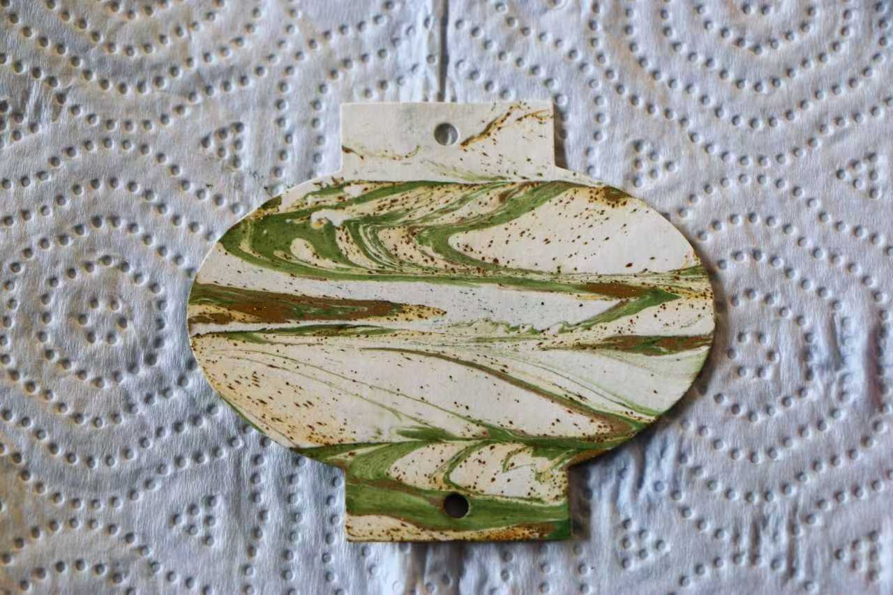 在了解了漆艺的历史和制作步骤后,翁海欣老师现场演示了漂漆书签的制作过程。王彩菲老师在旁辅助讲解制作原理,介绍大漆不溶于水的特性,以及如何将稀释剂与矿物颜料混合大漆,形成流动的“漂流漆”。她还详细演示了在水面创作图案的技巧,如点、甩、弹、划等手法,以及如何将宣纸工艺制成的扇面浸入水中,制作出变化无穷、光彩夺目的纹路。