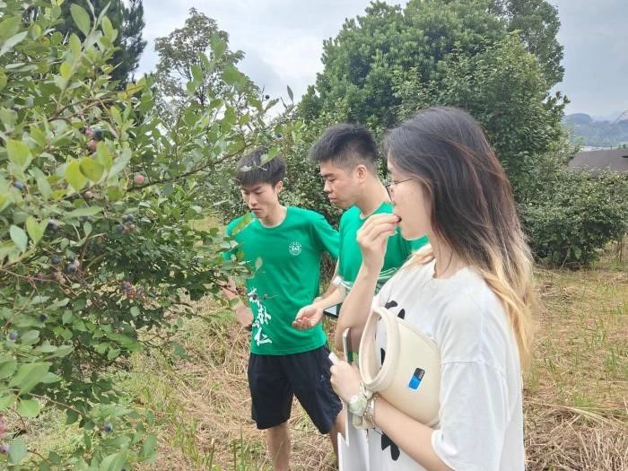 在下午,实践团前往农村,与农民种植大户进行交流学习,学习种植与采摘过程中的细节与难点、蓝莓的生长周期以及蓝莓的保藏工序。经过与农民大户的交流,实践队员发现由于销售渠道问题和外观看起来不如云南大果饱满问题等问题,导致麻江蓝莓麻江蓝莓售卖一直是以加工果为主。为此,实践团成员将在后续实践中设立抖音直播环节,鼓励和支持农户通过电商平台等渠道向消费者销售麻江蓝莓。