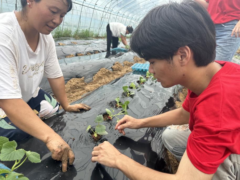 种植瓜苗的人员向同学们介绍并演示种植方法:“咱们先用手在膜布覆盖的土地挖出一个手指深度的坑,然后把瓜苗放进来,再用土覆盖,每株瓜苗距离半米左右,最后,再对瓜苗浇水,这样瓜苗的种植就完成了。”团队成员在此过程认真学习种植步骤和注意事项,增强自身本领。