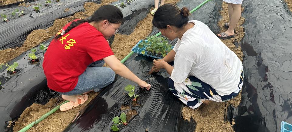 图为团队成员上手实践种植瓜苗。潘晓晨 供图