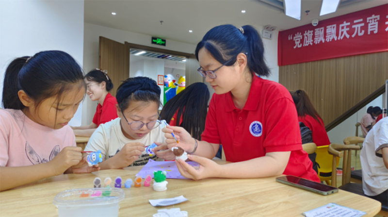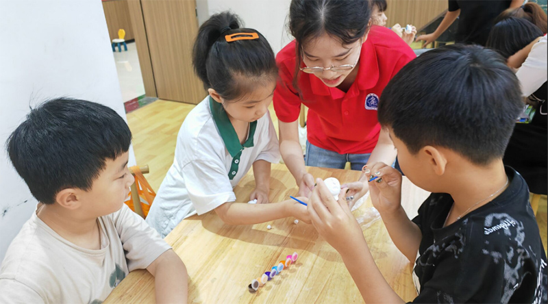 图为“薪火筑梦,医路乡阳”社会实践团队成员和小朋友们拿起画笔,兴致勃勃地投入到石膏娃娃的彩绘创作中。