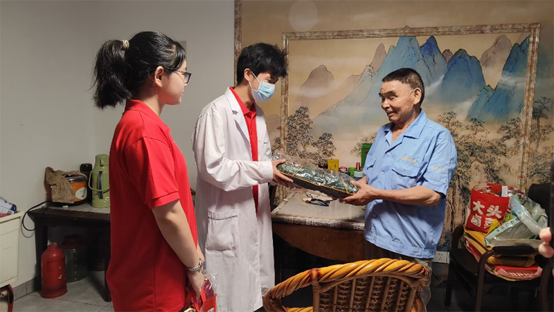 图为“薪火筑梦,医路乡阳”社会实践团队成员为特殊人员送礼品。