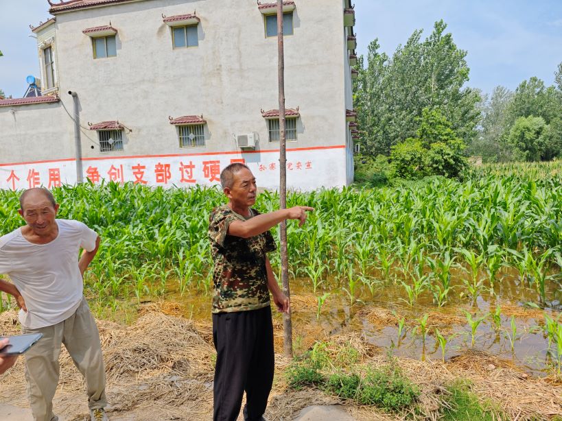 (图为:孙聚寨乡前后杨村村支书介绍农田受灾情况)
