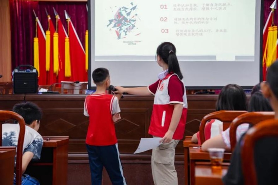 成员林泽铭通过游戏和互动,让大湾镇学子深入探索“我是……”的性格特质、“我能……”的能力边界、“我喜欢……”的兴趣所在和 “我希望……”的价值观追求。学子们在互动中踊跃分享,彼此激励,共绘成长蓝图。