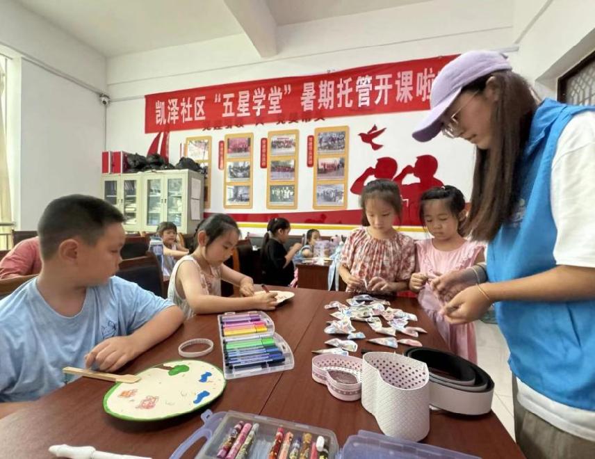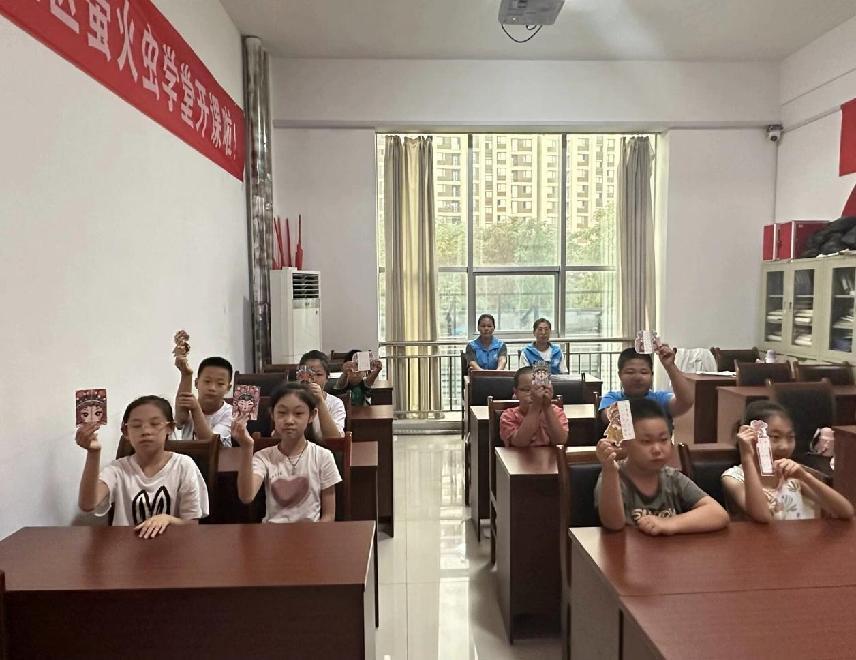 图为社会实践队员教授儿童绘制带有戏曲元素图案的扇子,将传统文化以创新的形式发扬出去,从而激发儿童对于戏曲文化的传承力和创造力,此举有助于促进戏曲与“劳”育相结合。高川