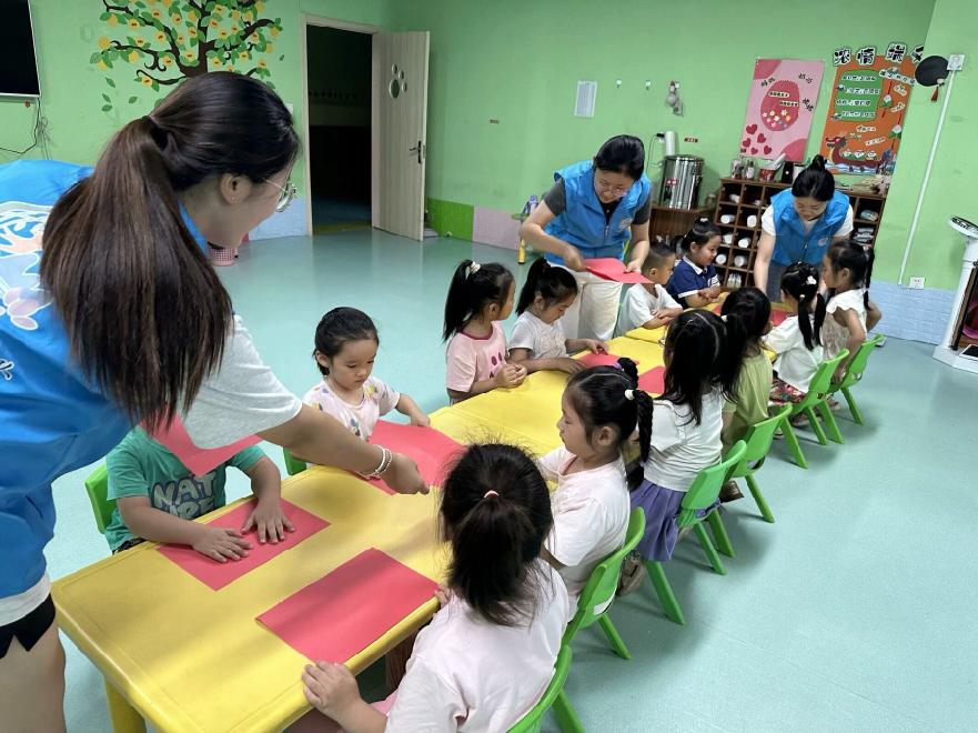 图为实践队员在爱乐亲幼儿园开展戏曲文化分享与趣味剪纸活动,通过剪纸做出戏曲中的脸谱的方式,来对儿童进行戏曲的启蒙教育,传播中华优秀戏曲文化,此次活动旨在实现戏曲文化与“德”育相结合。李孟赛 供图。